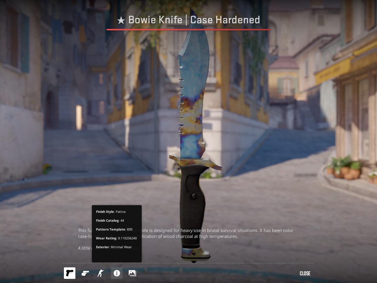 The Bowie Knife has a large blade surface, making a full-blue appearance visually impressive. This makes the appearance of the ★ Bowie Knife | Case Hardened inimitable.