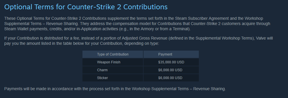 Now, CS2 uses a flat-payment system. If your item gets accepted into the game, Valve pays you a one-time amount based on the type of content you made:
