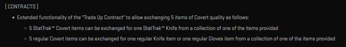 The update focuses on the "Trade Up Contract." Players can now trade five Covert-rarity (red) skins to receive one guaranteed knife or pair of gloves.